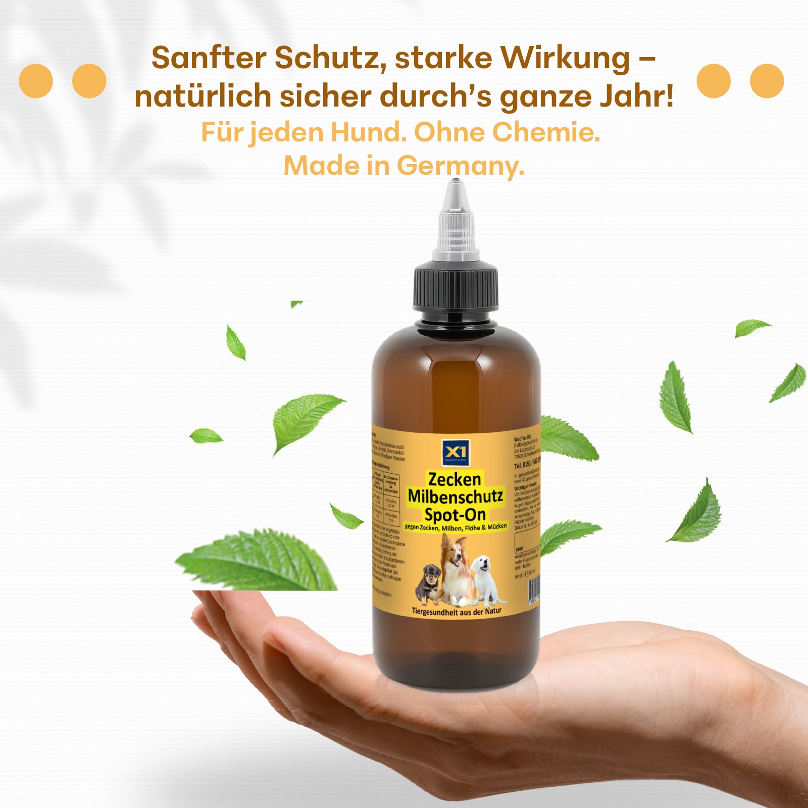 Durch die Anwendung mit unserem X1 Zecken-, Floh- und Milbenschutz machen Sie sich und Ihre Tiere uninteressant für Zecken, Flöhe und Co.