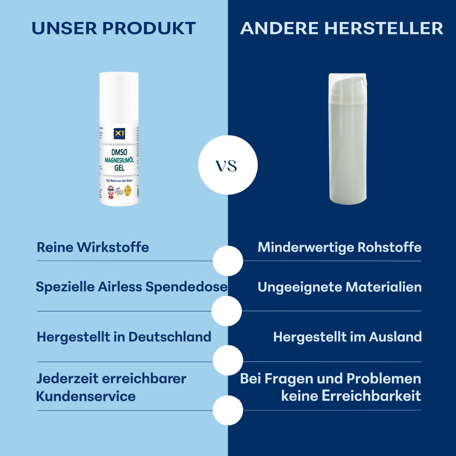 - ✅ DMSO flüssig wird auch für X1 DMSO Gel -Salbe und -Spray in Varianten mit Magnesiumchlorid, Mädesuess und Weihrauch angeboten.