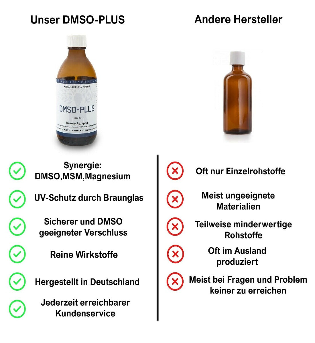 - Hinweis: Es gibt bei DMSO sehr große Qualitätsunterschiede und zweifelhafte Herkünfte, die sich natürlich auch im Preis niederschlagen. Manche Literpreise sollten genauer hinterfragt werden. Wir wurden schon öfters auf diesen Punkt angesprochen und werden aus Qualitätsgründen nicht von unserem Preis abweichen. Wir entwickeln und produzieren alle unsere Produkte in Deutschland selber. Deshalb wissen wir genau, was wir anbieten.